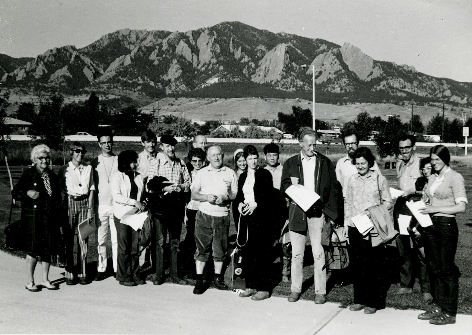 First IAB fieldtrip, Colorado 1973. From left: Eva Sobel, Patricia Nelson, Mark Seaward, Yolanda Alcorte, Gregory Kunkel, Robbert Gradstein, Marie-Claire Verdus, Willem Margadant, Ernest-J. Bonnot, Leila Shultz, Marie-Chantal Fabre, Kunito Nehira, Peter Florschütz, Norton Miller, Jeanne Florschütz, Andries Touw, Nancy Slack, Catharine Lafarge. (Photograph taken by fieldtrip organizer Bill Weber).